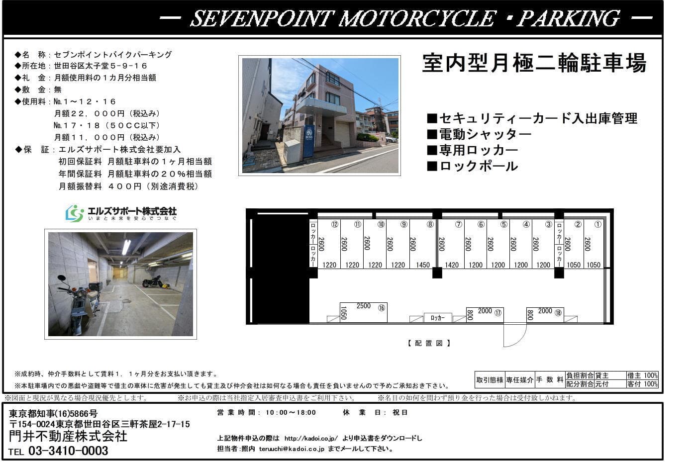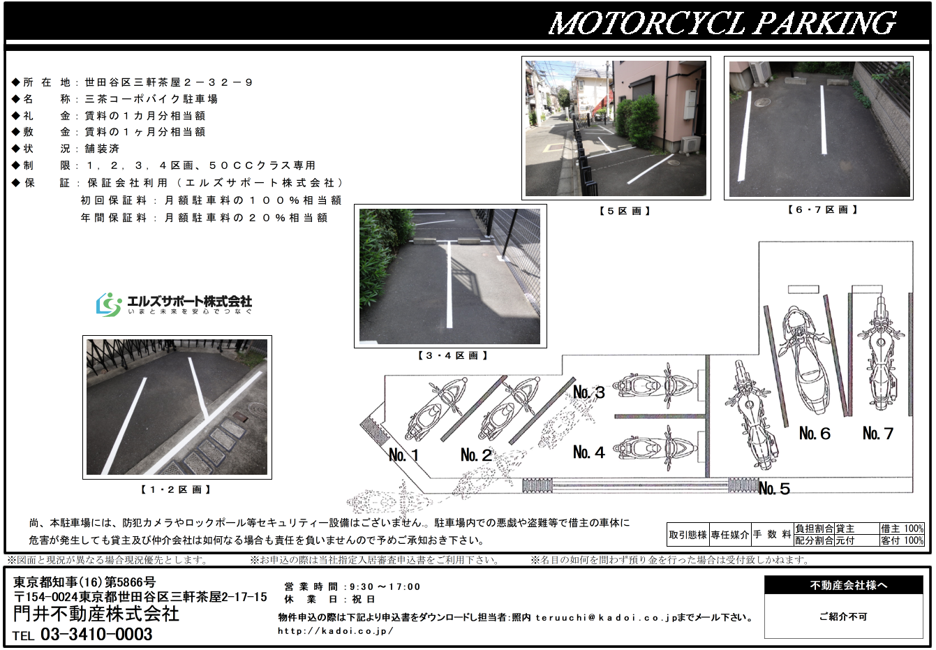 月極駐車場 代沢4丁目駐車場 世田谷区代沢4-5-6 NO.1 30,000円(別途消費税) 敷金:1ヶ月 荒居パーキング 世田谷区三軒茶屋1-26-4 NO.1 36,000円(別途消費税) 敷金:1ヶ月 ※軽自動車のみ 月極バイクパーキング セブンポイントバイクG 世田谷区太子堂5-9-16 NO.17 11,000円(50ccのみ) セブンポイントバイクG 世田谷区太子堂5-9-16 NO.1~5/7/8/10/12/16 22,000円 三茶コーポバイク駐車場 世田谷区三軒茶屋2-32-9 NO.3 5,500円 バイクパーキング太子堂 世田谷区太子堂2-23-1 NO.5 15,000円 門井不動産株式会社 TEL:03-3410-0003 FAX:03-3410-0009 営業時間:10時から18時 定休日:祝日・夏季・年末年始