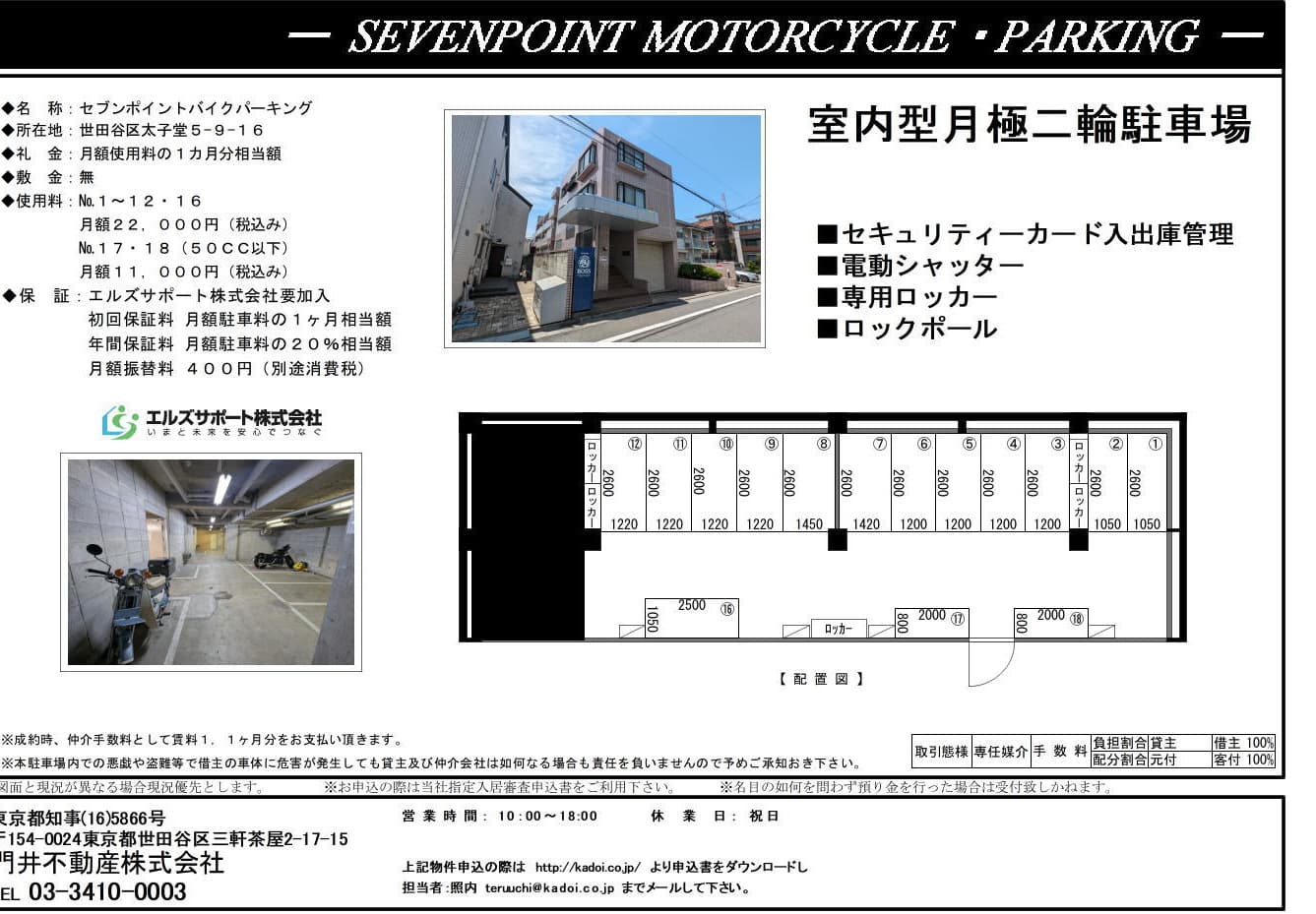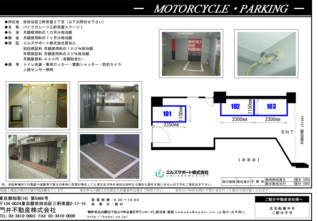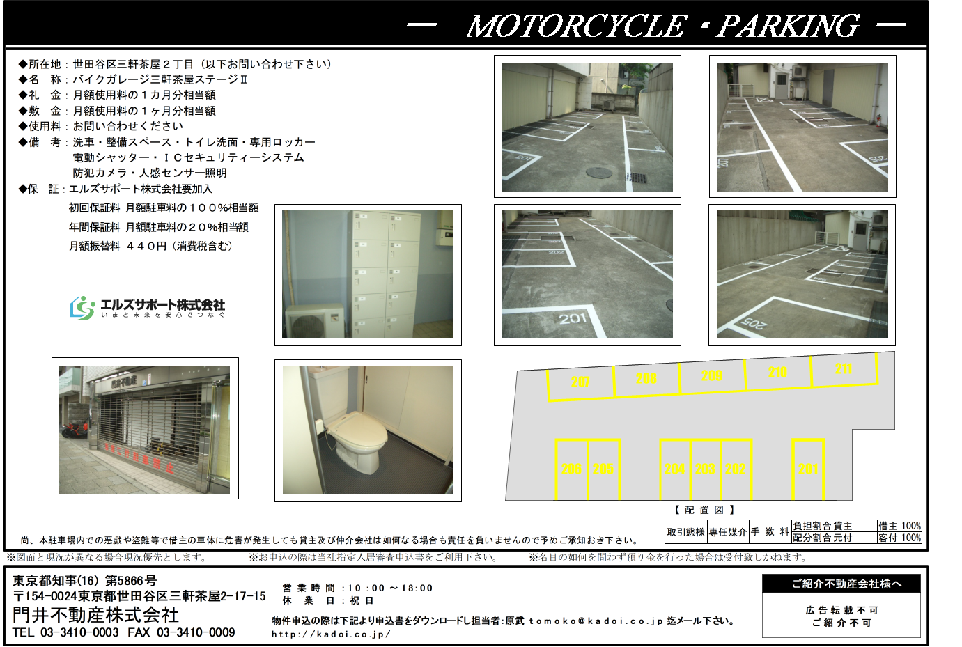 月極駐車場 代沢4丁目駐車場 世田谷区代沢4-5-6 NO.1 30,000円(別途消費税) 敷金:1ヶ月 荒居パーキング 世田谷区三軒茶屋1-26-4 NO.1 36,000円(別途消費税) 敷金:1ヶ月 ※軽自動車のみ 月極バイクパーキング 三茶コーポバイク駐車場 世田谷区三軒茶屋2-32-9 NO.3 5,500円 バイクガレージ三軒茶屋stageⅡ 世田谷区三軒茶屋2-41-2 NO.205 8,000円 バイクガレージ三軒茶屋stageⅠ 世田谷区三軒茶屋2-41-2 NO.101 15,000円 セブンポイントバイクG 世田谷区太子堂5-9-16 NO.17 11,000円(50ccのみ) セブンポイントバイクG 世田谷区太子堂5-9-16 NO.1~5/7/8/10/12/16 22,000円 門井不動産株式会社 TEL:03-3410-0003 FAX:03-3410-0009 営業時間:10時から18時 定休日:祝日・夏季・年末年始
